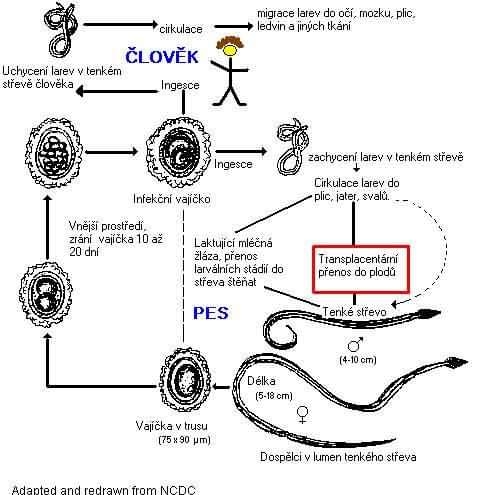 Toxoplasmóza: Pes není definitivním hostitelem parazita, který způsobuje toxoplasmózu (definitivním hostitelem jsou pouze kočkovité šelmy). Člověk se proto nemůže od psa nakazit z jeho výkalů, jak bývá často mylně uváděno, ale pouze tak, že by pozřel tepelně neopracovanou svalovinu psa nemocného toxoplasmózou (což už se doufám v našich podmínkách neděje !). Nejčastější způsob nakažení toxoplasmózou v našich podmínkách je z tepelně neopracovaného masa jiných nakažených živočichů (nejčastěji králík, hovězí maso). Nemusí jít zrovna o krvavý biftek, stačí, když na kuchyňském prkénku krájíme maso (toto pak samozřejmě uvaříme, upečeme - prostě tepelně opracujeme), prkénko potom pouze setřeme nebo nedostatečně opláchneme a na stejném prkénku nakrájíme např. zeleninu, kterou použijeme jako přílohu, ale tepelně ji už neopracujeme